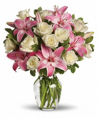 This stunning bouquet features hand-picked elegant white roses and sweet pink Asiatic lilies that blend together seamlessly, as if they were meant to be in the same vase.